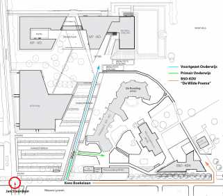 De basisschool ligt komende vanuit de Jan Steenlaan rechts naast de parkeerplaats.